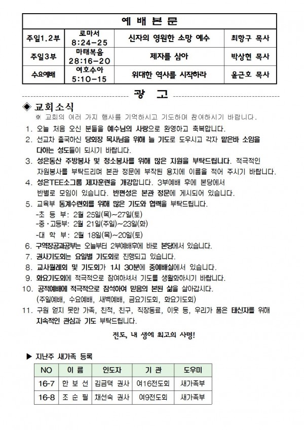 2016년 1월 24일 예배본문 & 교회소식 페이지 정보 작성자 최고관리자 작성일16-01-22 15:38 조회10,374회 관련링크 이전글 다음글 목록 본문 2016년 1월 24일 예배본문 & 교회소식 이전글 다음글 목록