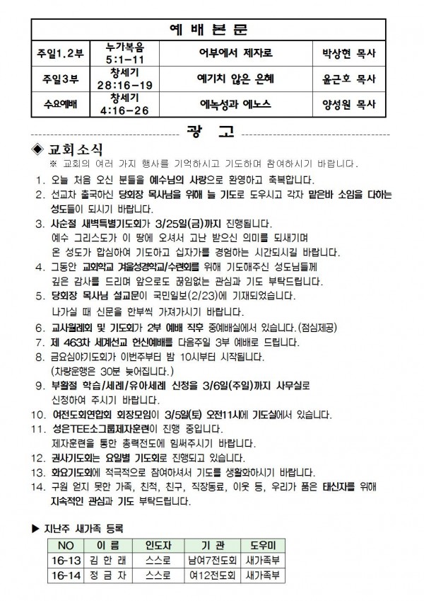 2016년 2월 28일 예배본문 & 교회소식 페이지 정보 작성자 최고관리자 작성일16-02-26 17:25 조회10,514회 관련링크 이전글 다음글 목록 본문 2016년 2월 28일 예배본문 & 교회소식 이전글 다음글 목록