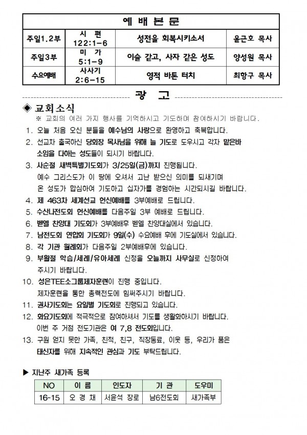 2016년 3월 6일 예배본문 & 교회소식 페이지 정보 작성자 최고관리자 작성일16-03-04 14:11 조회10,284회 관련링크 이전글 다음글 목록 본문 2016년 3월 6일 예배본문 & 교회소식 이전글 다음글 목록