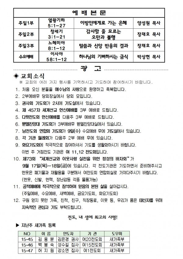 2015년 9월 6일 예배본문 & 교회소식 페이지 정보 작성자 최고관리자 작성일15-09-04 17:57 조회10,169회 관련링크 이전글 다음글 목록 본문 2015년 9월 6일 예배본문 & 교회소식 이전글 다음글 목록