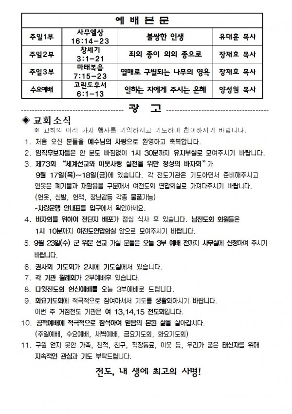 2015년 9월 13일 예배본문 & 교회소식 페이지 정보 작성자 최고관리자 작성일15-09-11 15:42 조회10,106회 관련링크 이전글 다음글 목록 본문 2015년 9월 13일 예배본문 & 교회소식 이전글 다음글 목록