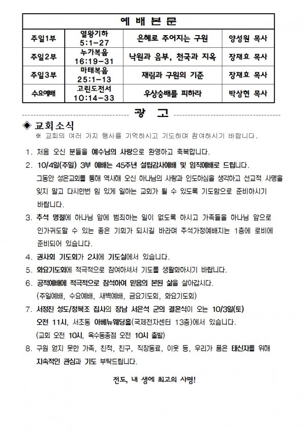 2015년 9월 27일 예배본문 & 교회소식 페이지 정보 작성자 최고관리자 작성일15-09-27 09:12 조회9,800회 관련링크 이전글 다음글 목록 본문 2015년 9월 27일 예배본문 & 교회소식 이전글 다음글 목록