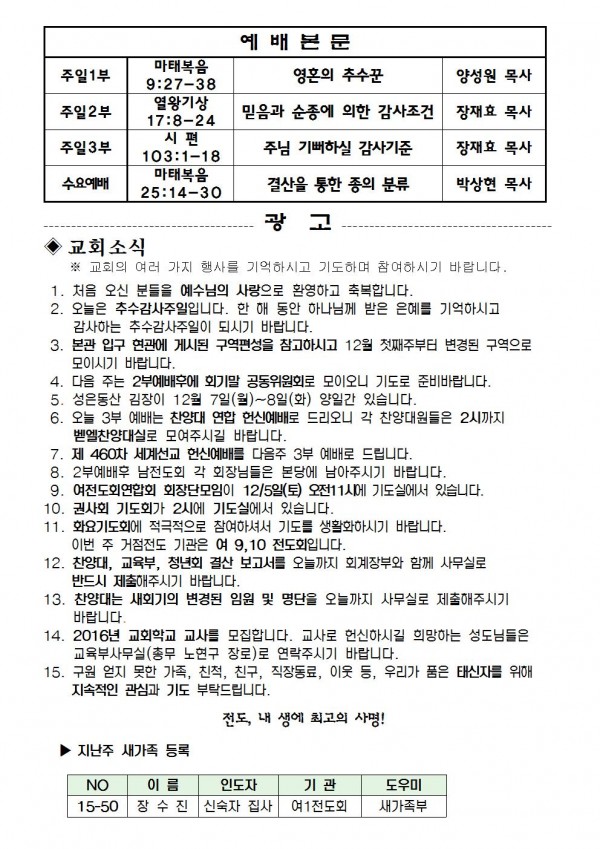 2015년 11월 29일 예배본문 & 교회소식 페이지 정보 작성자 최고관리자 작성일15-11-27 18:09 조회10,209회 관련링크 이전글 다음글 목록 본문 2015년 11월 29일 예배본문 & 교회소식 이전글 다음글 목록