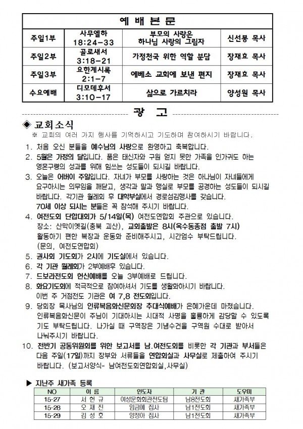 2015년 5월 10일 예배본문 & 교회소식 페이지 정보 작성자 최고관리자 작성일15-05-08 17:59 조회10,062회 관련링크 이전글 다음글 목록 본문 2015년 5월 10일 예배본문 & 교회소식 이전글 다음글 목록