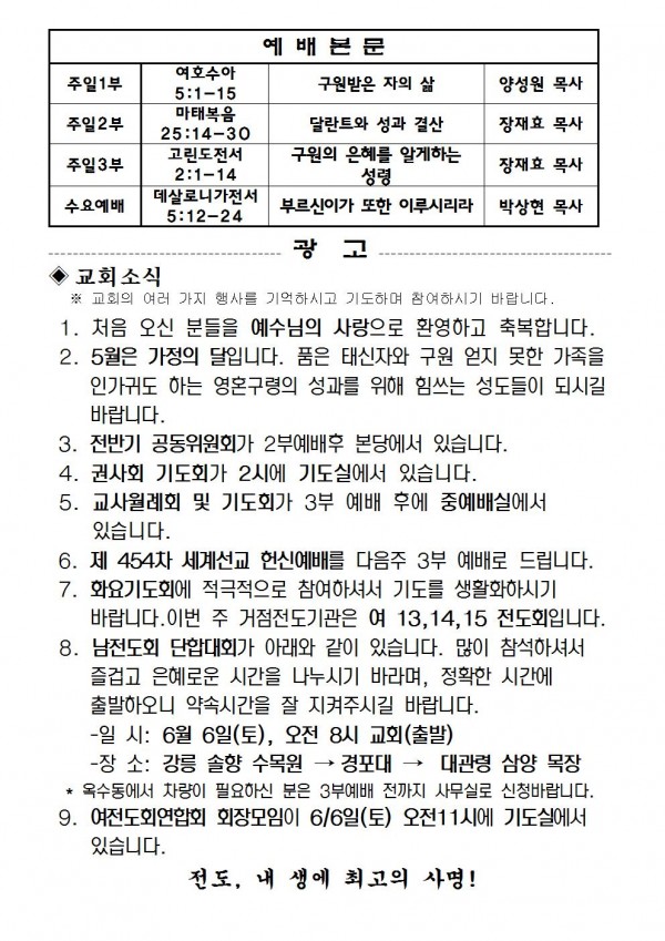 2015년 5월 31일 예배본문 & 교회소식 페이지 정보 작성자 최고관리자 작성일15-05-29 18:25 조회10,240회 관련링크 이전글 다음글 목록 본문 2015년 5월 31일 예배본문 & 교회소식 이전글 다음글 목록