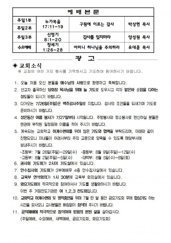 2015년 7월 19일 예배본문 & 교회소식 페이지 정보 작성자 최고관리자 작성일15-07-17 15:53 조회10,380회 관련링크 이전글 다음글 목록 본문 2015년 7월 19일 예배본문 & 교회소식 이전글 다음글 목록