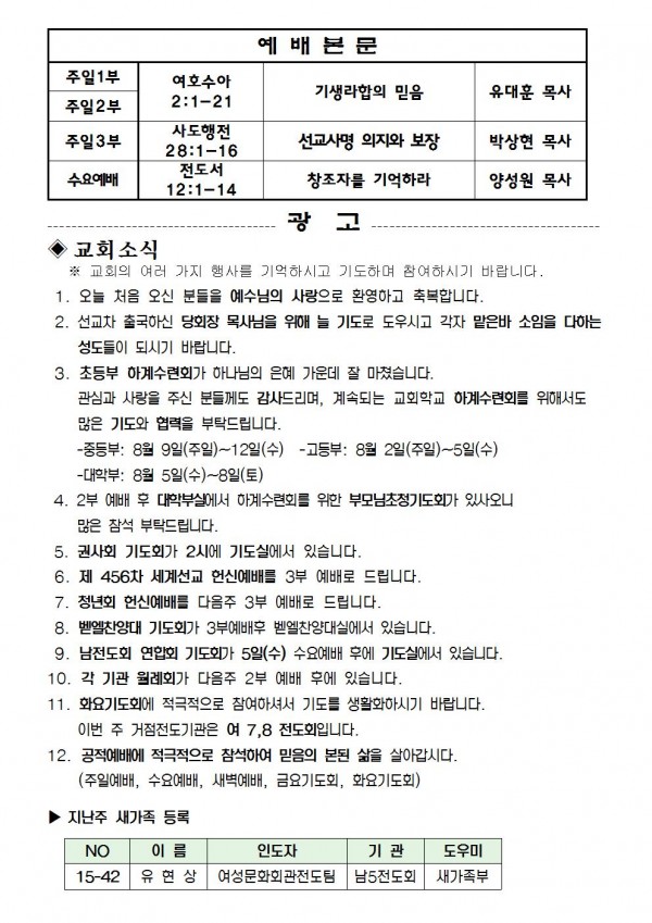 2015년 8월 2일 예배본문 & 교회소식 페이지 정보 작성자 최고관리자 작성일15-07-31 16:04 조회10,415회 관련링크 이전글 다음글 목록 본문 2015년 8월 2일 예배본문 & 교회소식 이전글 다음글 목록