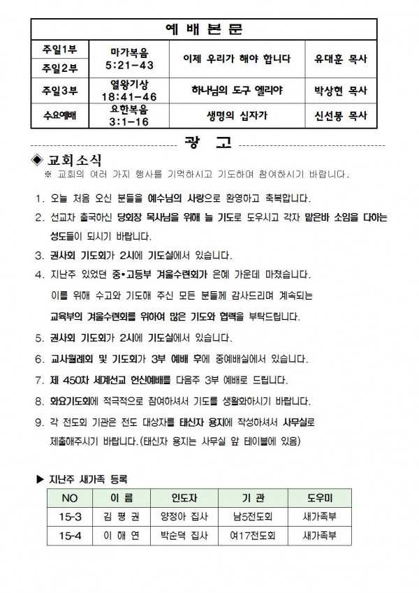 2015년 1월 25일 예배본문 & 교회소식 페이지 정보 작성자 최고관리자 작성일15-01-23 16:27 조회10,222회 관련링크 이전글 다음글 목록 본문 2015년 1월 25일 예배본문 & 교회소식 이전글 다음글 목록