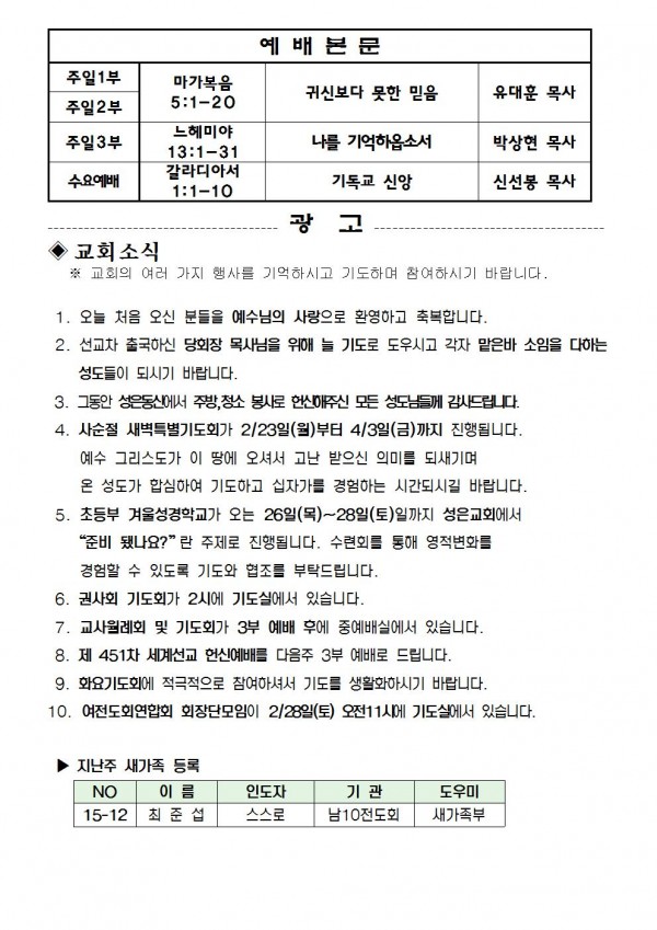 2015년 2월 22일 예배본문 & 교회소식 페이지 정보 작성자 최고관리자 작성일15-02-17 16:15 조회10,057회 관련링크 이전글 다음글 목록 본문 2015년 2월 22일 예배본문 & 교회소식 이전글 다음글 목록