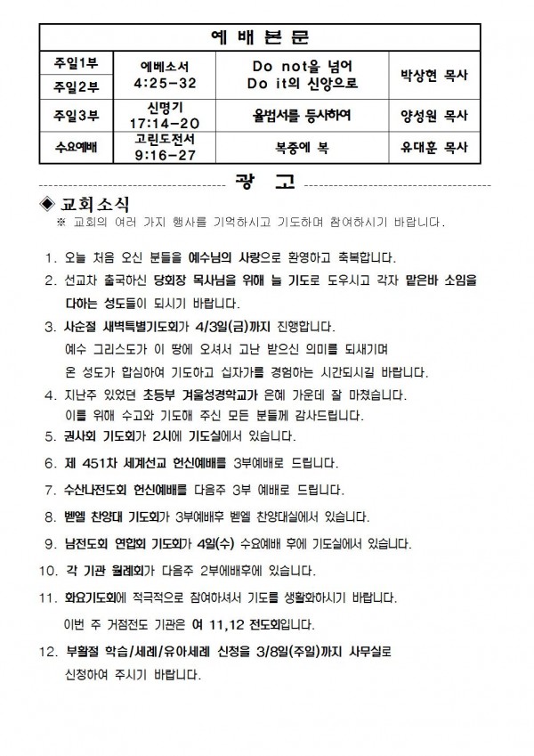 2015년 3월 1일 예배본문 & 교회소식 페이지 정보 작성자 최고관리자 작성일15-02-27 15:24 조회10,035회 관련링크 이전글 다음글 목록 본문 2015년 3월 1일 예배본문 & 교회소식 이전글 다음글 목록