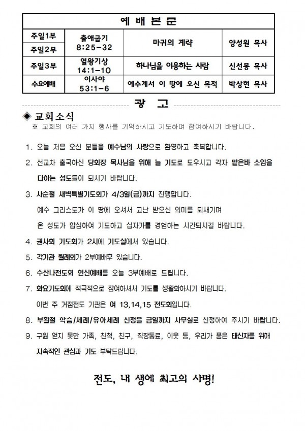 2015년 3월 8일 예배본문 & 교회소식 페이지 정보 작성자 최고관리자 작성일15-03-06 16:25 조회10,331회 관련링크 이전글 다음글 목록 본문 2015년 3월 8일 예배본문 & 교회소식 이전글 다음글 목록