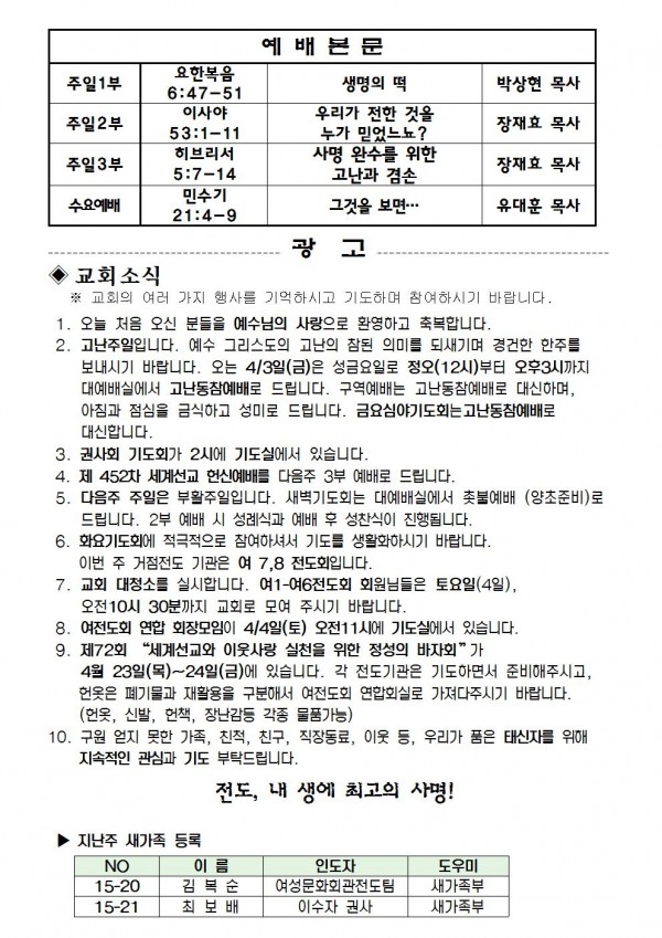2015년 3월 29일 예배본문 & 교회소식 페이지 정보 작성자 최고관리자 작성일15-03-27 17:20 조회10,083회 관련링크 이전글 다음글 목록 본문 2015년 3월 29일 예배본문 & 교회소식 이전글 다음글 목록