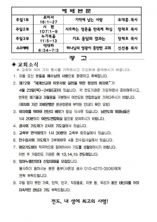 2015년 4월 19일 예배본문 & 교회소식 페이지 정보 작성자 최고관리자 작성일15-04-17 16:04 조회9,803회 관련링크 이전글 다음글 목록 본문 2015년 4월 19일 예배본문 & 교회소식 이전글 다음글 목록