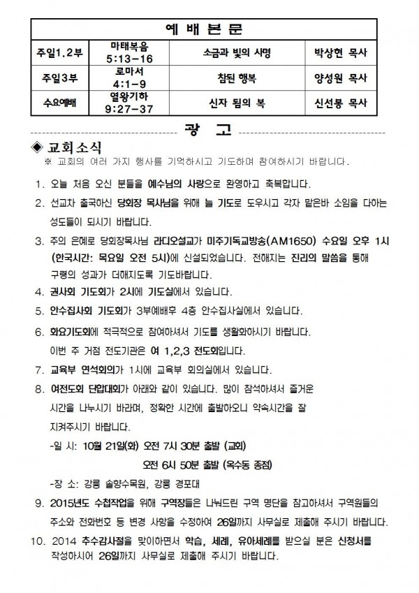 2014년 10월 19일 예배본문 & 교회소식 페이지 정보 작성자 최고관리자 작성일14-10-19 09:22 조회9,916회 관련링크 이전글 다음글 목록 본문 2014년 10월 19일 예배본문 & 교회소식 이전글 다음글 목록