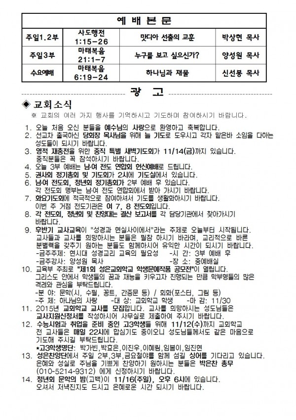 2014년 11월 9일 예배본문 & 교회소식 페이지 정보 작성자 최고관리자 작성일14-11-07 19:36 조회10,037회 관련링크 이전글 다음글 목록 본문 2014년 11월 9일 예배본문 & 교회소식 이전글 다음글 목록