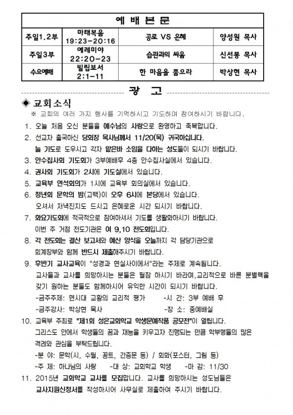 2014년 11월 16일 예배본문 & 교회소식 페이지 정보 작성자 최고관리자 작성일14-11-14 14:16 조회10,014회 관련링크 이전글 다음글 목록 본문 2014년 11월 16일 예배본문 & 교회소식 이전글 다음글 목록