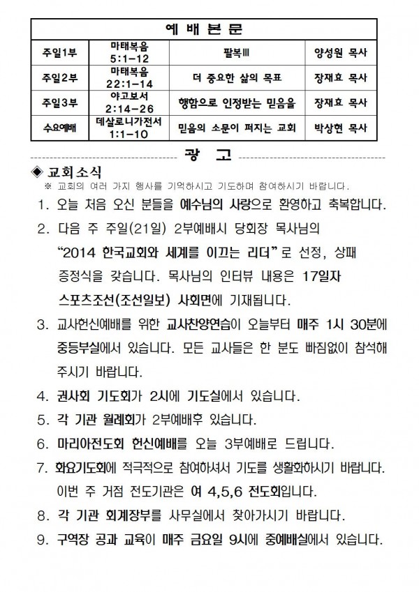 2014년 12월 14일 예배본문 & 교회소식 페이지 정보 작성자 최고관리자 작성일14-12-12 19:26 조회10,068회 관련링크 이전글 다음글 목록 본문 2014년 12월 14일 예배본문 & 교회소식 이전글 다음글 목록
