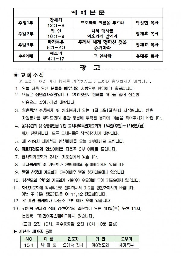 2015년 1월 4일 예배본문 & 교회소식 페이지 정보 작성자 최고관리자 작성일15-01-02 18:06 조회10,333회 관련링크 이전글 다음글 목록 본문 2015년 1월 4일 예배본문 & 교회소식 이전글 다음글 목록