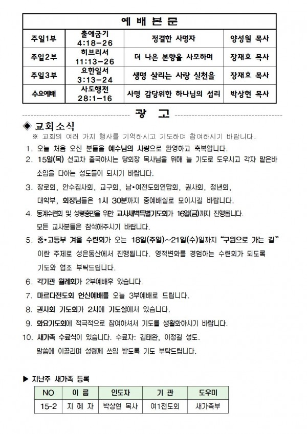 2015년 1월 11일 예배본문 & 교회소식 페이지 정보 작성자 최고관리자 작성일15-01-09 17:49 조회10,497회 관련링크 이전글 다음글 목록 본문 2015년 1월 11일 예배본문 & 교회소식 이전글 다음글 목록
