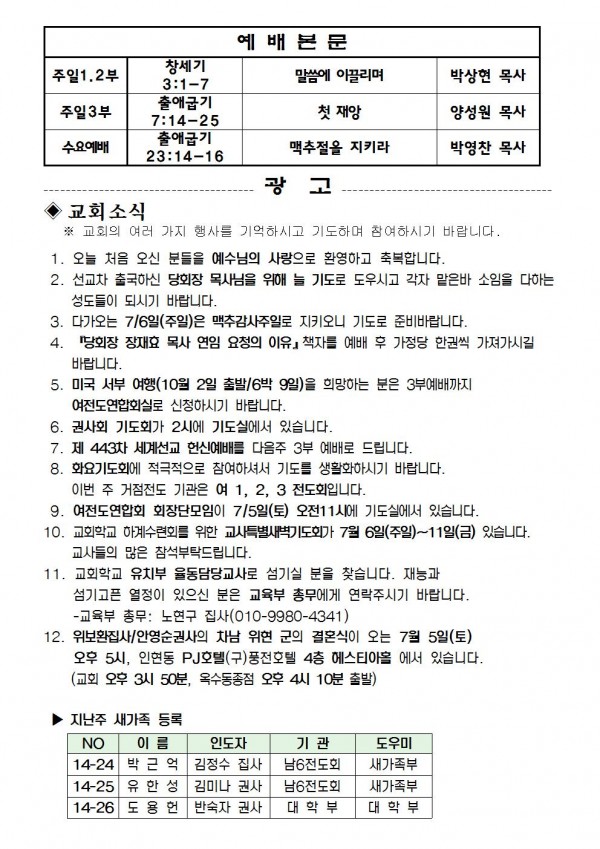 2014년 6월 29일 예배본문 & 교회소식 페이지 정보 작성자 최고관리자 작성일14-06-27 16:50 조회9,975회 관련링크 이전글 다음글 목록 본문 2014년 6월 29일 예배본문 & 교회소식 이전글 다음글 목록