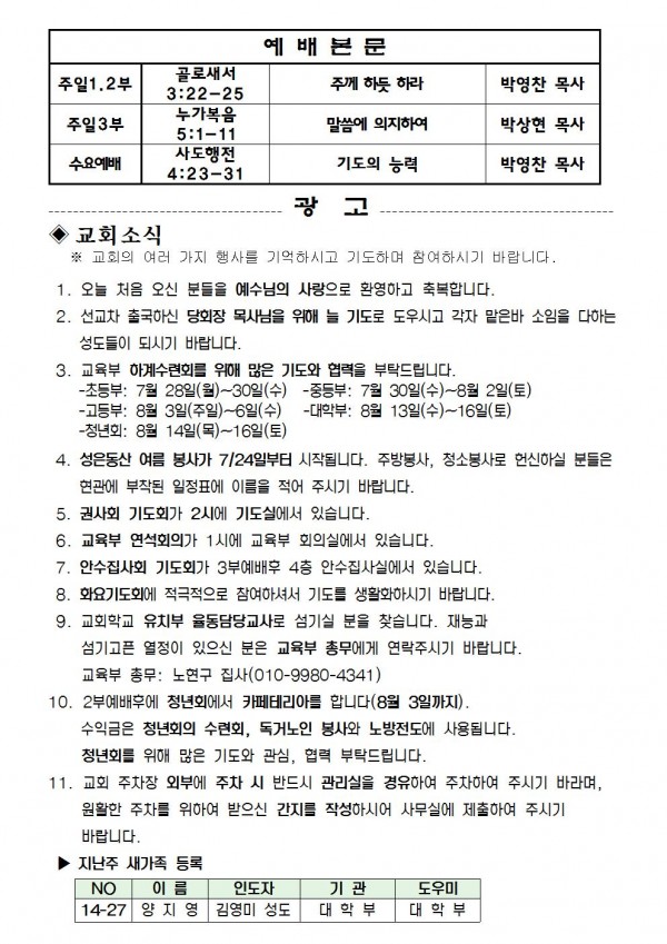 2014년 7월 20일 예배본문 & 교회소식 페이지 정보 작성자 최고관리자 작성일14-07-19 14:28 조회10,345회 관련링크 이전글 다음글 목록 본문 2014년 7월 20일 예배본문 & 교회소식 이전글 다음글 목록