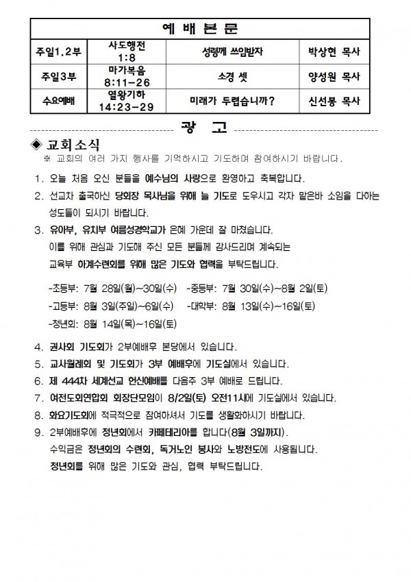 2014년 7월 27일 예배본문 & 교회소식 페이지 정보 작성자 최고관리자 작성일14-07-25 14:32 조회10,283회 관련링크 이전글 다음글 목록 본문 2014년 7월 27일 예배본문 & 교회소식 이전글 다음글 목록