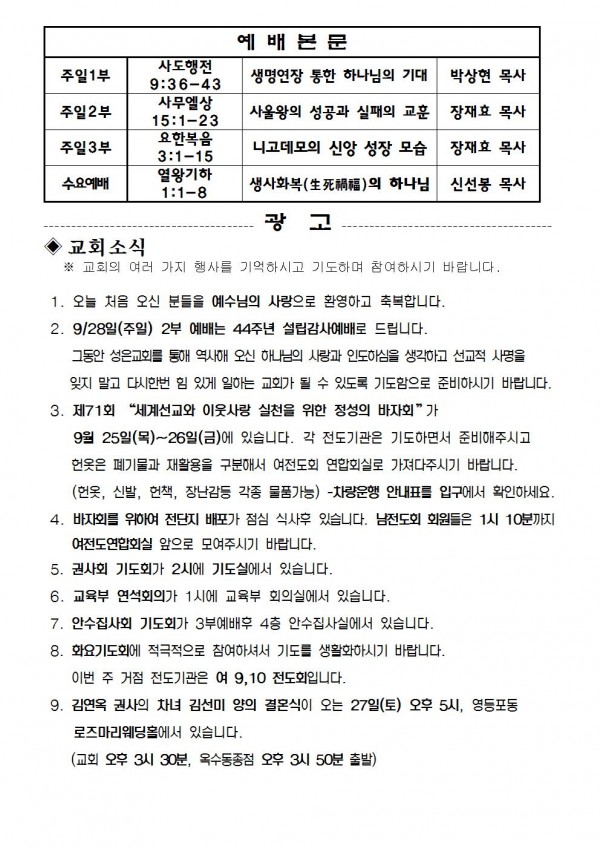2014년 9월 21일 예배본문 & 교회소식 페이지 정보 작성자 최고관리자 작성일14-09-19 17:55 조회9,810회 관련링크 이전글 다음글 목록 본문 2014년 9월 21일 예배본문 & 교회소식 이전글 다음글 목록