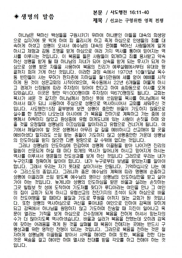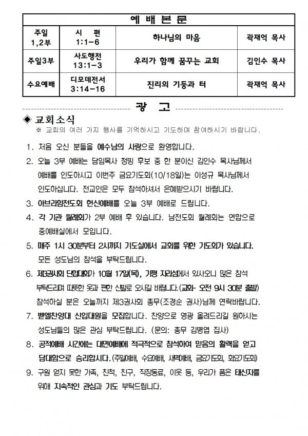 2024년 10월 13일 예배본문 & 교회소식 페이지 정보 작성자 성은교회 작성일24-10-11 15:59 조회3,716회 관련링크 이전글 다음글 목록 본문 2024년 10월 13일 예배본문 & 교회소식 이전글 다음글 목록