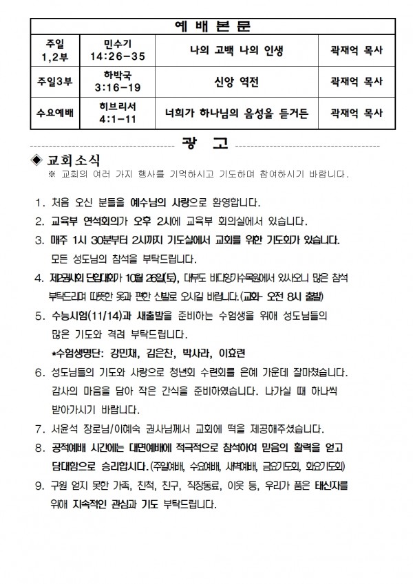 2024년 10월 20일 예배본문 & 교회소식 페이지 정보 작성자 성은교회 작성일24-10-18 16:33 조회3,655회 관련링크 이전글 다음글 목록 본문 2024년 10월 20일 예배본문 & 교회소식 이전글 다음글 목록