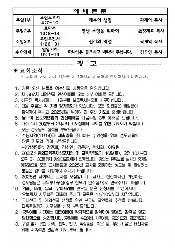 2024년 11월 3일 예배본문 & 교회소식 페이지 정보 작성자 성은교회 작성일24-11-01 16:47 조회3,664회 관련링크 이전글 다음글 목록 본문 2024년 11월 3일 예배본문 & 교회소식 이전글 다음글 목록