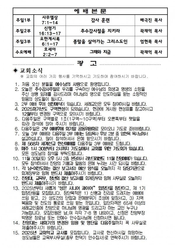 2024년 11월 24일 예배본문 & 교회소식 페이지 정보 작성자 성은교회 작성일24-11-22 22:23 조회3,624회 관련링크 이전글 다음글 목록 본문 2024년 11월 24일 예배본문 & 교회소식 이전글 다음글 목록