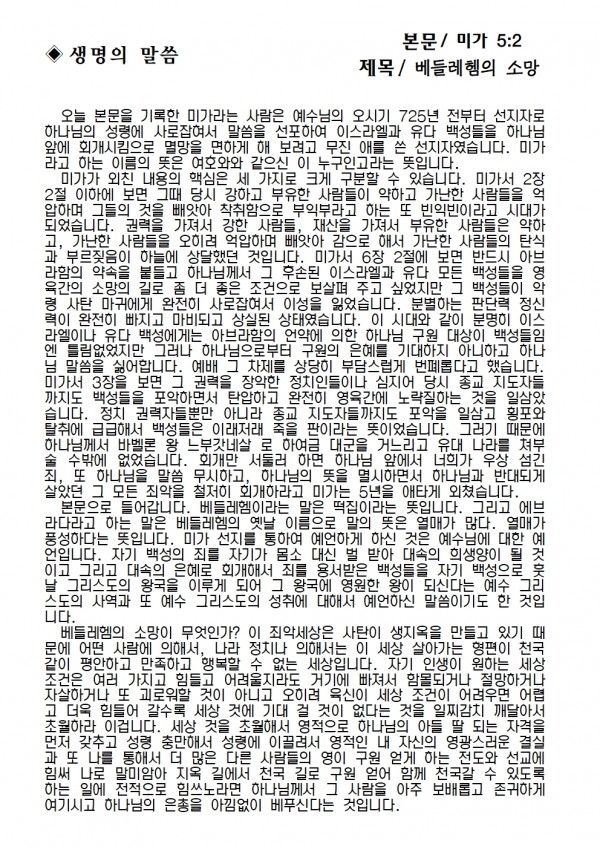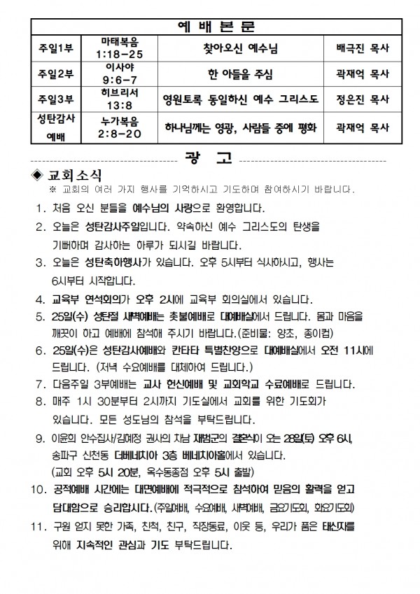 2024년 12월 22일 예배본문 & 교회소식 페이지 정보 작성자 성은교회 작성일24-12-20 16:22 조회3,578회 관련링크 이전글 다음글 목록 본문 2024년 12월 22일 예배본문 & 교회소식 이전글 다음글 목록