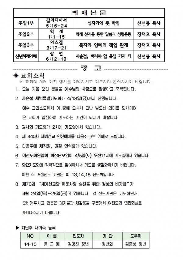 2014년 3월 30일 예배본문 & 교회소식 페이지 정보 작성자 최고관리자 작성일14-03-28 17:07 조회10,173회 관련링크 이전글 다음글 목록 본문 2014년 3월 30일 예배본문 & 교회소식 이전글 다음글 목록