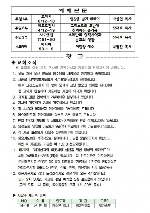 2014년 4월 6일 예배본문 & 교회소식 페이지 정보 작성자 최고관리자 작성일14-04-04 15:30 조회10,399회 관련링크 이전글 다음글 목록 본문 2014년 4월 6일 예배본문 & 교회소식 이전글 다음글 목록