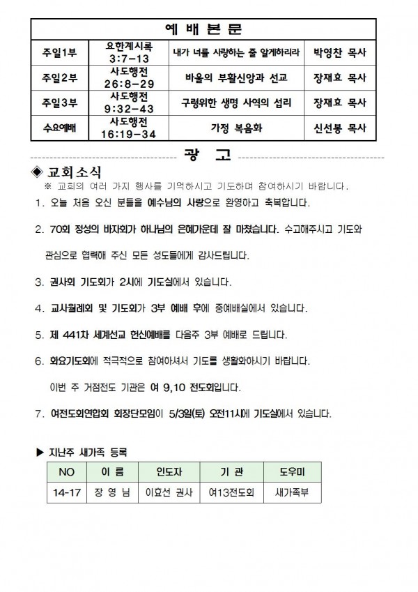 2014년 4월 27예배본문 & 교회소식 페이지 정보 작성자 최고관리자 작성일14-04-27 09:07 조회10,038회 관련링크 이전글 다음글 목록 본문 2014년 4월 27예배본문 & 교회소식 이전글 다음글 목록