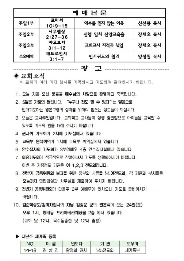 2014년 5월 18일 예배본문 & 교회소식 페이지 정보 작성자 최고관리자 작성일14-05-16 13:48 조회9,920회 관련링크 이전글 다음글 목록 본문 2014년 5월 18일 예배본문 & 교회소식 이전글 다음글 목록
