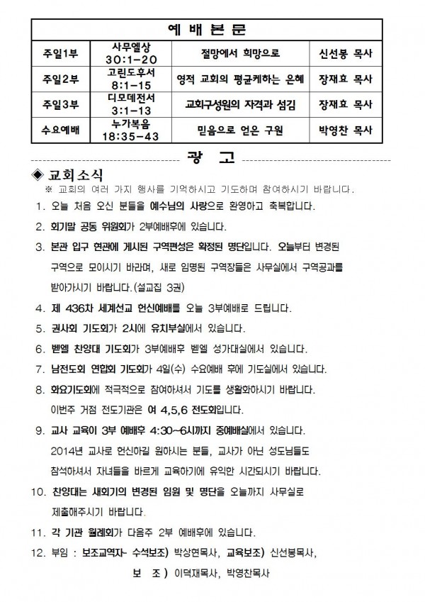 2013년 12월 01일 예배본문 & 교회소식 페이지 정보 작성자 최고관리자 작성일13-11-29 14:19 조회9,989회 관련링크 이전글 다음글 목록 본문 2013년 12월 01일 예배본문 & 교회소식 이전글 다음글 목록