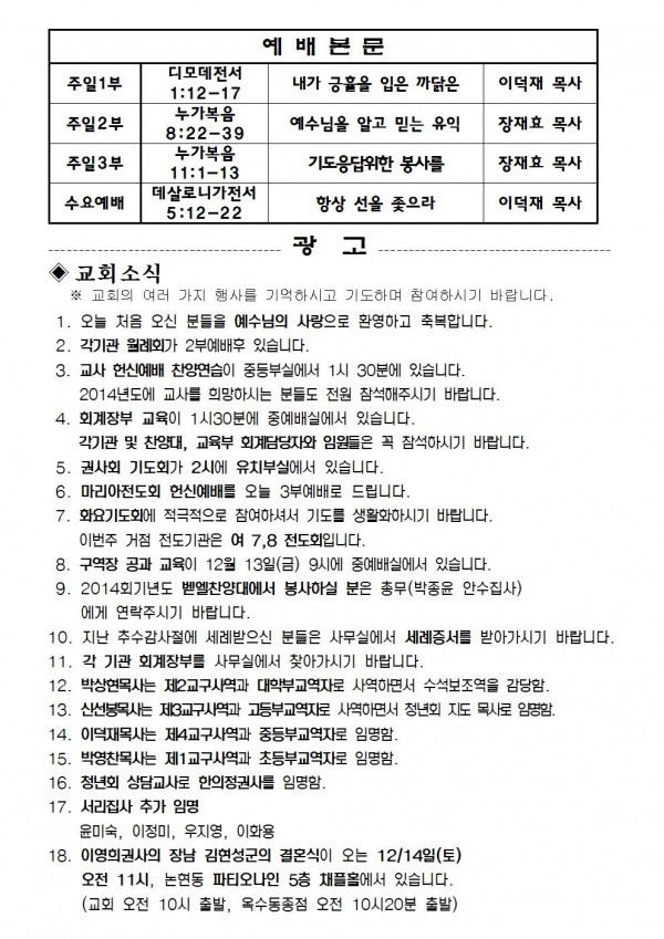 2013년 12월 08일 예배본문 & 교회소식 페이지 정보 작성자 최고관리자 작성일13-12-06 18:32 조회9,927회 관련링크 이전글 다음글 목록 본문 2013년 12월 08일 예배본문 & 교회소식 이전글 다음글 목록