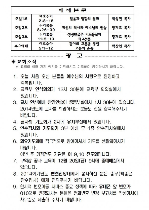 2013년 12월 15일 예배본문 & 교회소식 페이지 정보 작성자 최고관리자 작성일13-12-13 17:27 조회10,011회 관련링크 이전글 다음글 목록 본문 2013년 12월 15일 예배본문 & 교회소식 이전글 다음글 목록