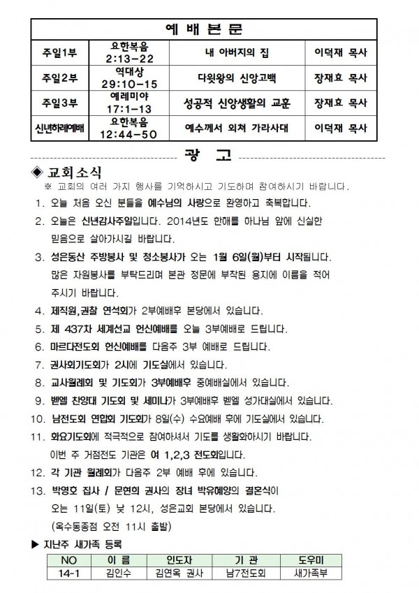 2014년 1월 5일 예배본문 & 교회소식 페이지 정보 작성자 최고관리자 작성일14-01-03 18:07 조회10,131회 관련링크 이전글 다음글 목록 본문 2014년 1월 5일 예배본문 & 교회소식 이전글 다음글 목록
