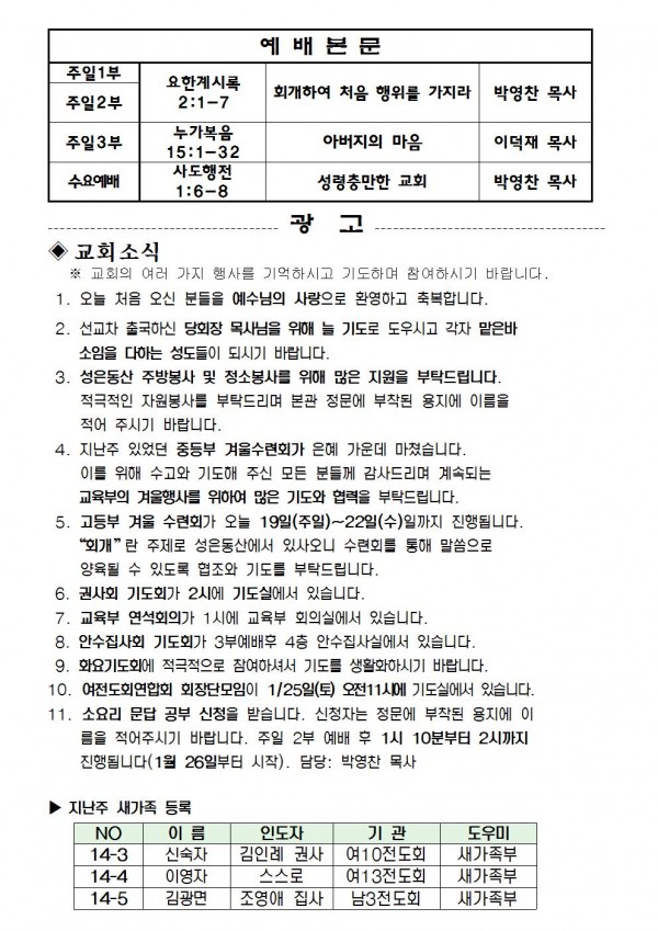 2014년 1월 19일 예배본문 & 교회소식 페이지 정보 작성자 최고관리자 작성일14-01-17 17:49 조회10,002회 관련링크 이전글 다음글 목록 본문 2014년 1월 19일 예배본문 & 교회소식 이전글 다음글 목록