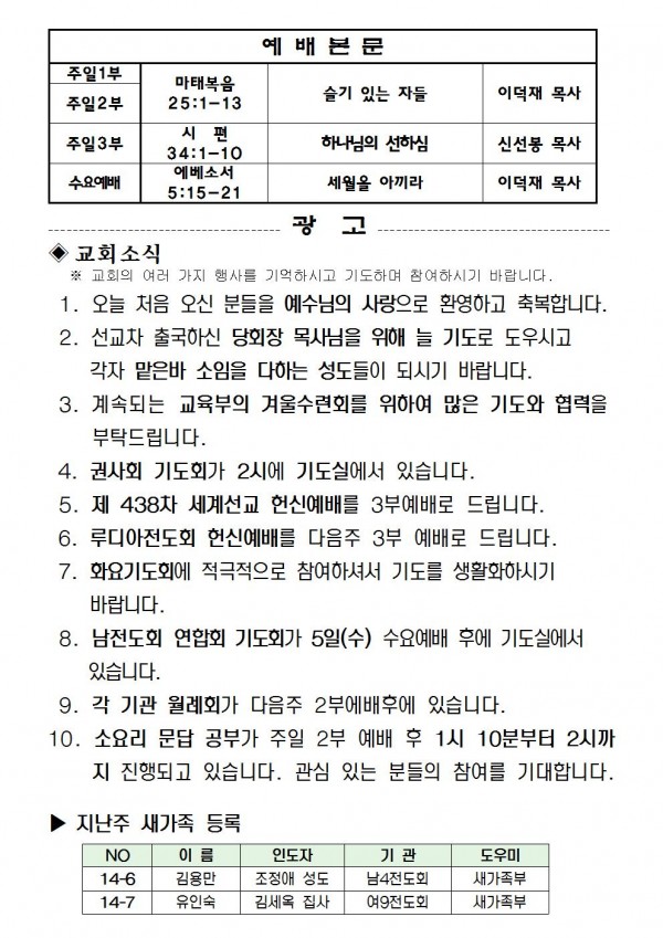 2014년 2월 2일 예배본문 & 교회소식 페이지 정보 작성자 최고관리자 작성일14-01-29 19:19 조회10,157회 관련링크 이전글 다음글 목록 본문 2014년 2월 2일 예배본문 & 교회소식 이전글 다음글 목록