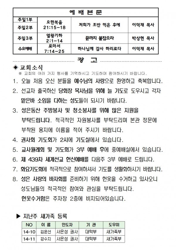 2014년 2월 23일 예배본문 & 교회소식 페이지 정보 작성자 최고관리자 작성일14-02-21 15:14 조회9,956회 관련링크 이전글 다음글 목록 본문 2014년 2월 23일 예배본문 & 교회소식 이전글 다음글 목록
