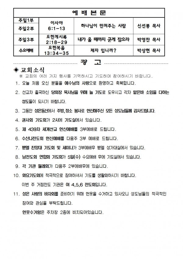 2014년 3월 2일 예배본문 & 교회소식 페이지 정보 작성자 최고관리자 작성일14-02-28 15:23 조회10,073회 관련링크 이전글 다음글 목록 본문 2014년 3월 2일 예배본문 & 교회소식 이전글 다음글 목록