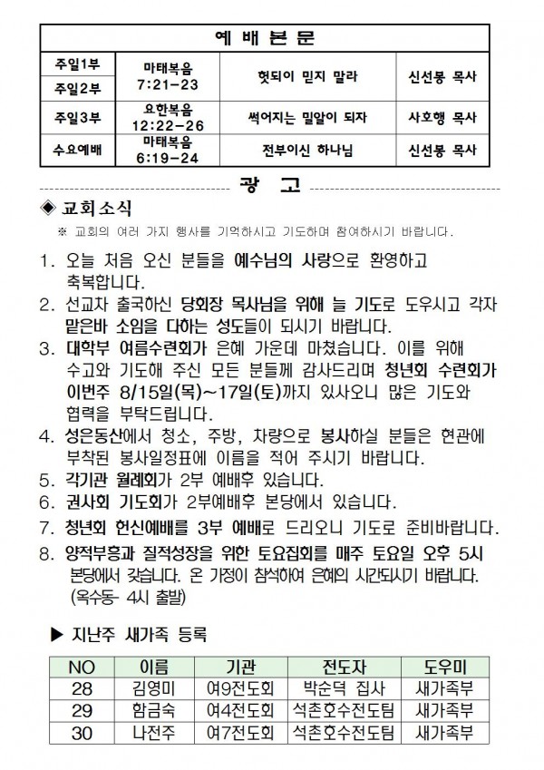 2013년 8월 11일 예배본문 & 교회소식 페이지 정보 작성자 최고관리자 작성일13-08-09 16:40 조회10,110회 관련링크 이전글 다음글 목록 본문 2013년 8월 11일 예배본문 & 교회소식 이전글 다음글 목록