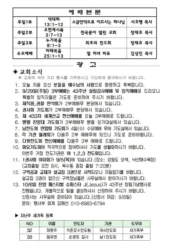 2013년 9월 1일 예배본문 & 교회소식 페이지 정보 작성자 최고관리자 작성일13-08-30 16:17 조회10,052회 관련링크 이전글 다음글 목록 본문 2013년 9월 1일 예배본문 & 교회소식 이전글 다음글 목록