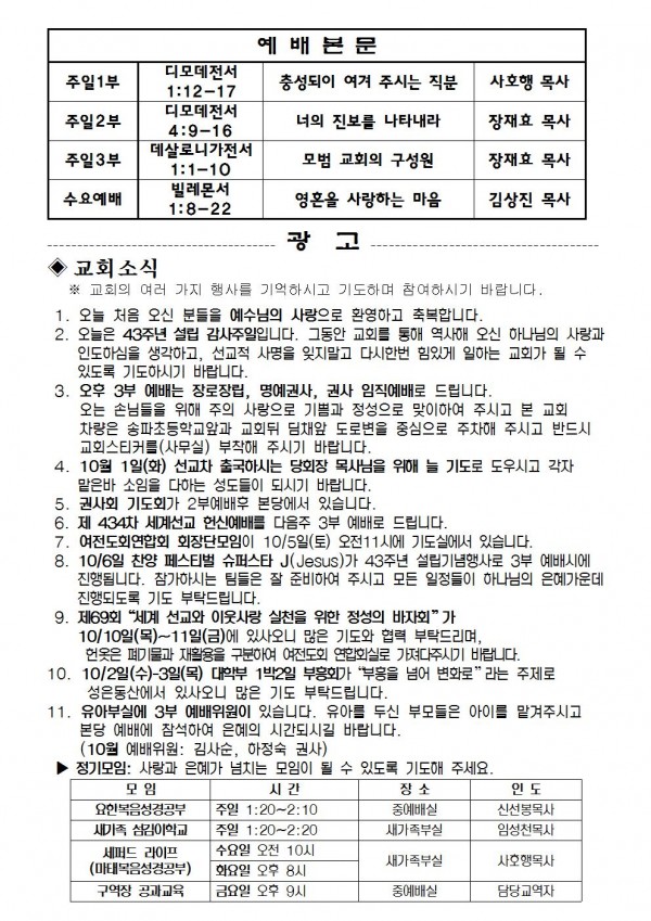 2013년 9월 29일 예배본문 & 교회소식 페이지 정보 작성자 최고관리자 작성일13-09-27 17:05 조회10,275회 관련링크 이전글 다음글 목록 본문 2013년 9월 29일 예배본문 & 교회소식 이전글 다음글 목록