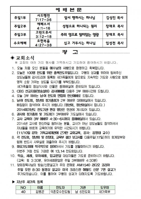 2013년 11월 10일 예배본문 & 교회소식 페이지 정보 작성자 최고관리자 작성일13-11-08 17:44 조회9,953회 관련링크 이전글 다음글 목록 본문 2013년 11월 10일 예배본문 & 교회소식 이전글 다음글 목록