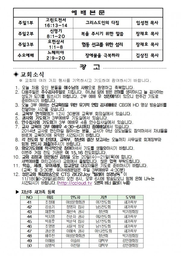 2013년 11월 17일 예배본문 & 교회소식 페이지 정보 작성자 최고관리자 작성일13-11-15 17:16 조회9,961회 관련링크 이전글 다음글 목록 본문 2013년 11월 17일 예배본문 & 교회소식 이전글 다음글 목록
