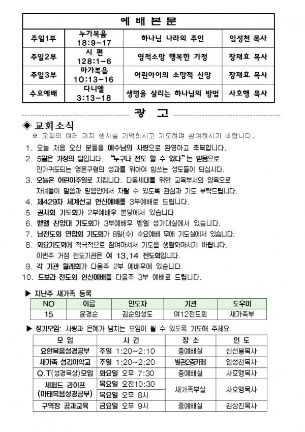2013년 5월 5일 예배본문 & 교회소식 페이지 정보 작성자 최고관리자 작성일13-05-03 19:33 조회10,296회 관련링크 이전글 다음글 목록 본문 2013년 5월 5일 예배본문 & 교회소식 이전글 다음글 목록